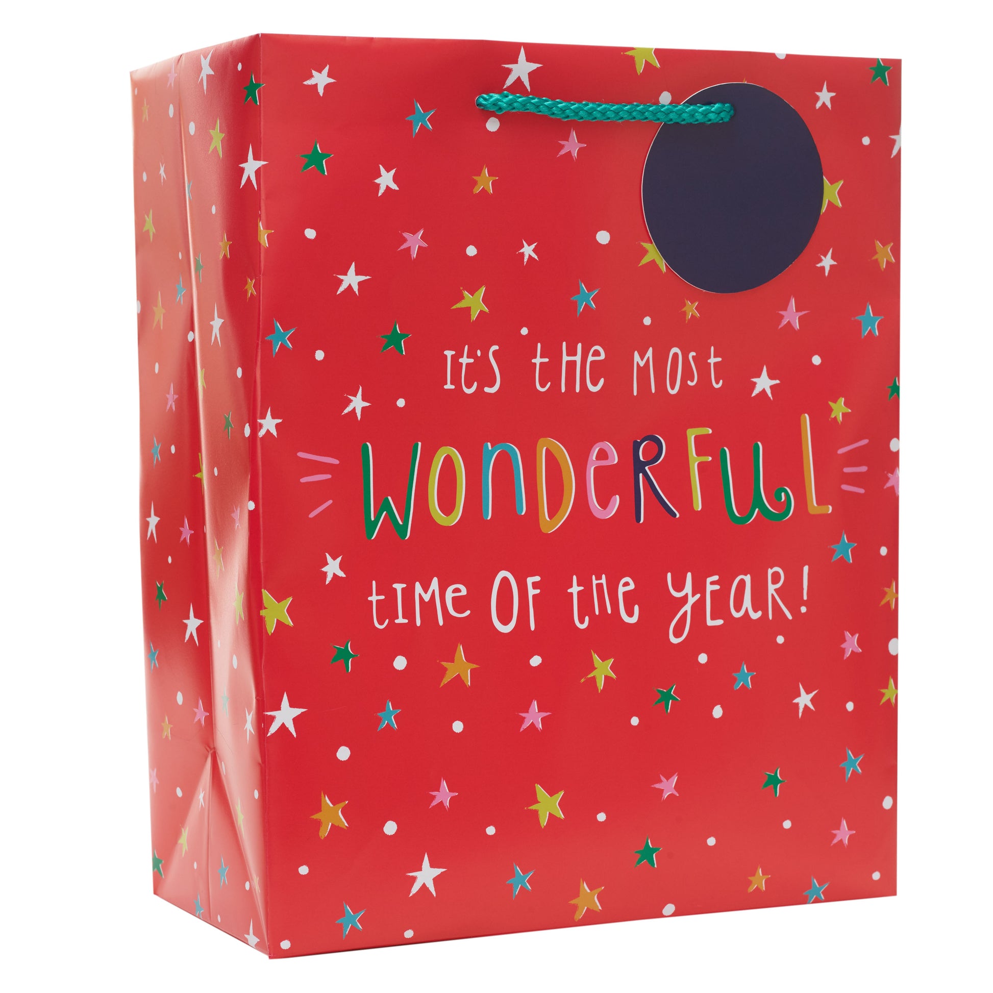 Details: This gift bag from UK Greetings' Essentials range is adorned with red, multicoloured stars and white dotty snowflakes, complete with the festive message, 'It's the most Wonderful time of the Year!'. It comes with a blue gift tag.