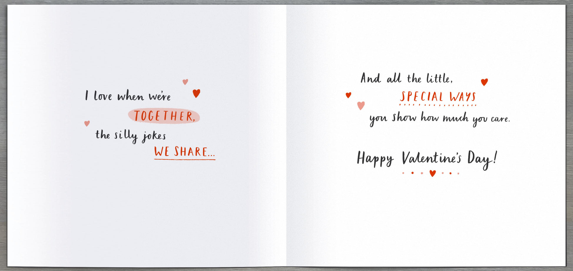 Message: I love when we're TOGETHER, the silly jokes WE SHARE… And all the little, SPECIAL WAYS you show how much you care. Happy Valentine's Day!