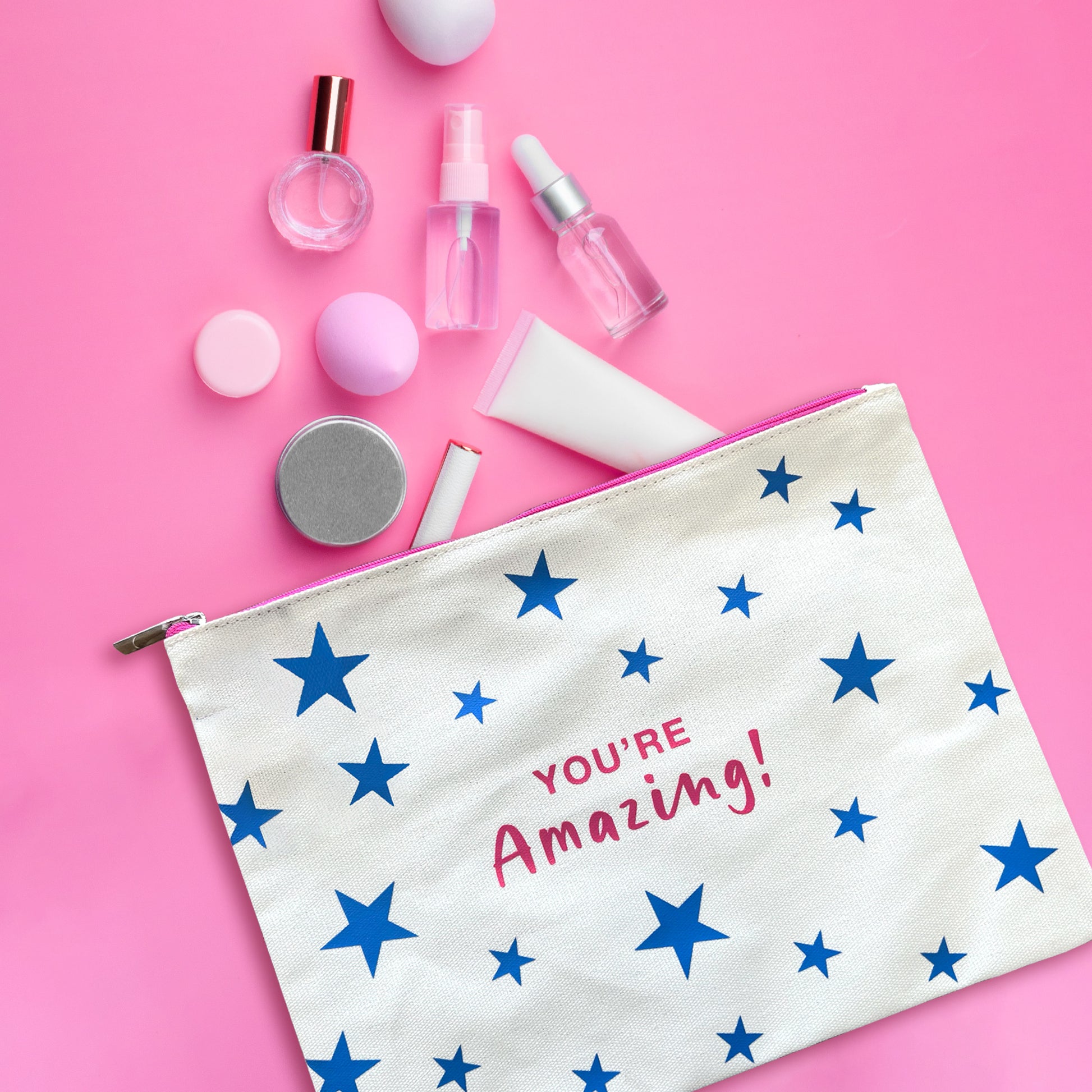 Looking for gift ideas for her? This charming cream pouch, adorned with blue stars and vibrant pink 'You're Amazing' lettering, is the perfect pick-me-up. Thoughtful and stylish, it reminds her of her worth and adds a touch of encouragement to every journey.